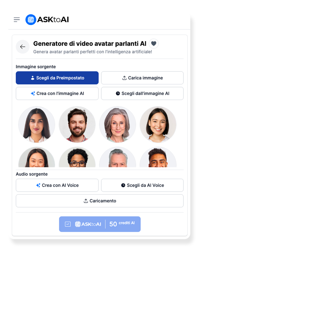 Con ASKtoAI Video, la tua voce prende forma: genera o carica un file audio e anima il tuo avatar.